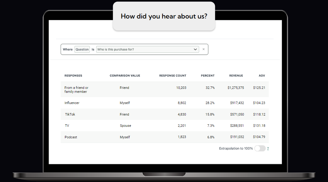Let's take a peek at customers who answered both the intriguing questions "Who is this purchase for?" and "How did you hear about us?" It's like shining a spotlight on the intersection of intent and influence.