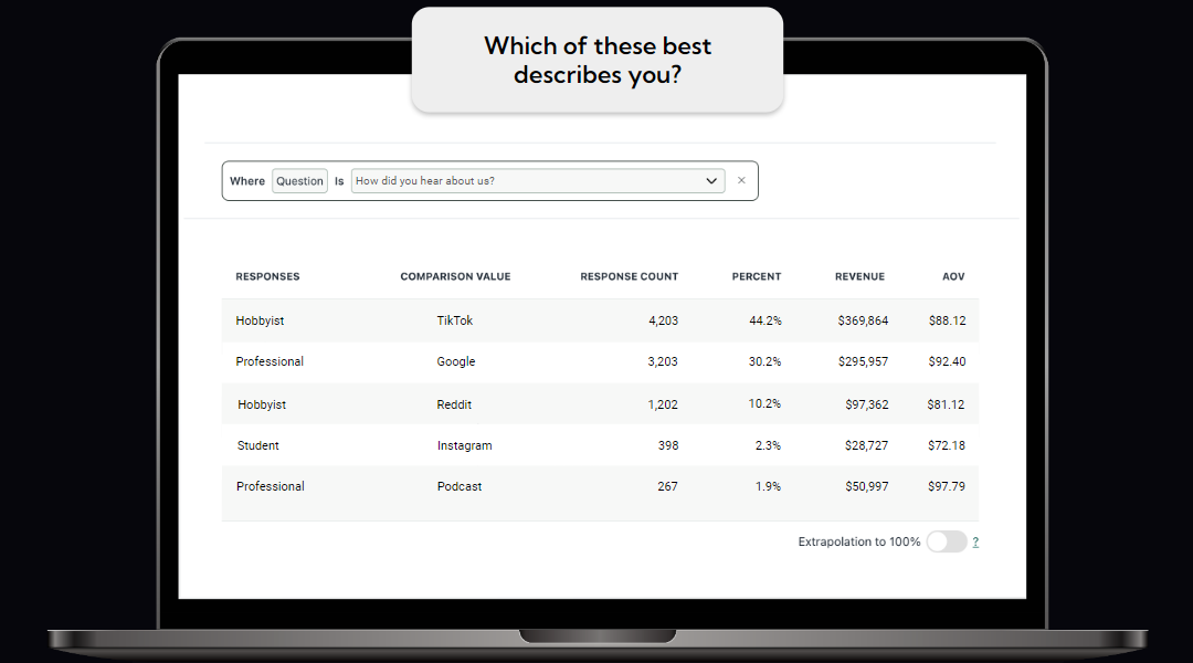 With every unique pair of responses settling comfortably into its own neatly laid out row. And you can effortlessly sift and sort through these revelations, using familiar signposts like Response Count, AOV, and more.