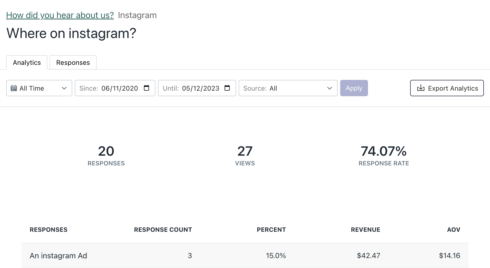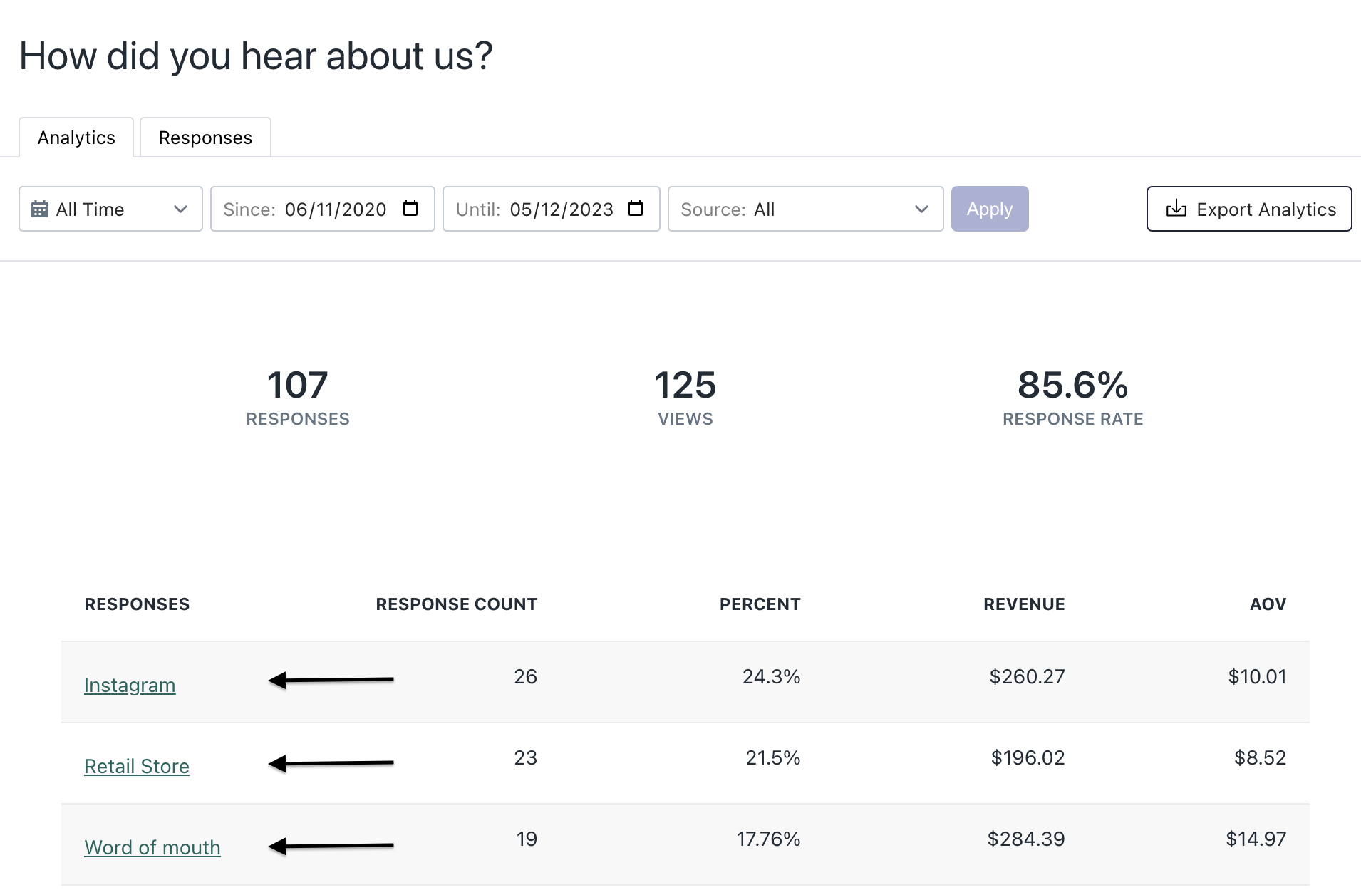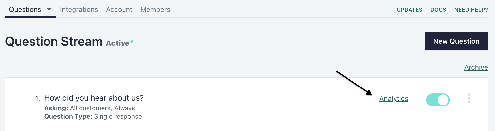 Start by popping over to the Question Stream® page. There, nestled right beside the title of your question, you'll find a little link called Analytics. Give it a click, and let it take you to your dashboard. Let's set the scene with an example: you've just asked your audience the seemingly straightforward question, "How did you hear about us?" Now, imagine their responses as puzzle pieces, waiting to be explored.
