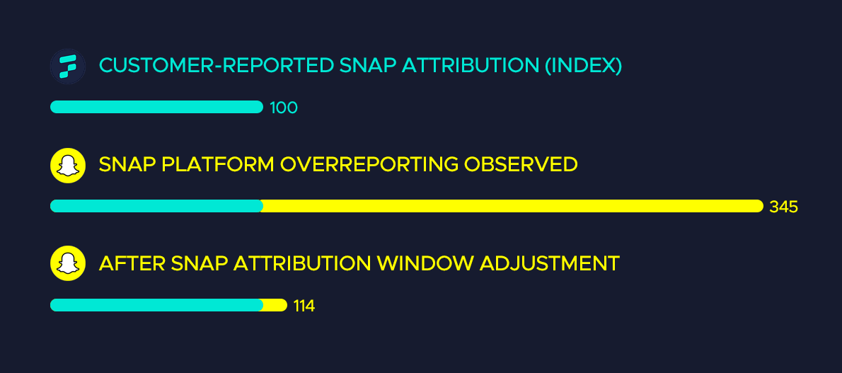 By shortening the window to resemble more of a direct response campaign, WITHIN quickly saw Snapchat’s attribution fall in line with what customers were reporting directly: a 10x improvement in precision between the two data sources, with Snap now over-reporting at a mere 14% against Fairing (well within the tolerances of the agency’s measurement science).