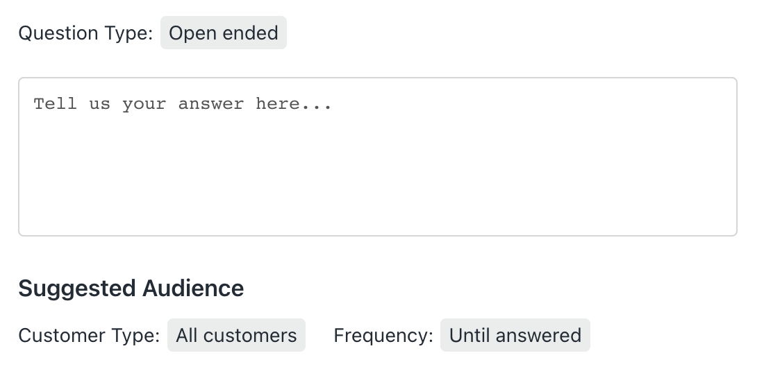 If you’re eager to get as many unique insights as possible, this question can be useful to ask New (or All) Customers — whereas asking Returning Customers only will likely produce responses that are more consistent with the brand positioning your shoppers have had multiple exposures to.