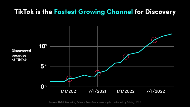 On September 19th, 2019, a Fairing brand received the first attribution response containing “TikTok” via a post-purchase survey. In the years since, Fairing has seen TikTok grow from an occasional write-in survey response under “Other”, into a formidable channel for discovery and conversion, becoming a full-fledged marketing strategy where more than 15% of consumers start their purchase journey.