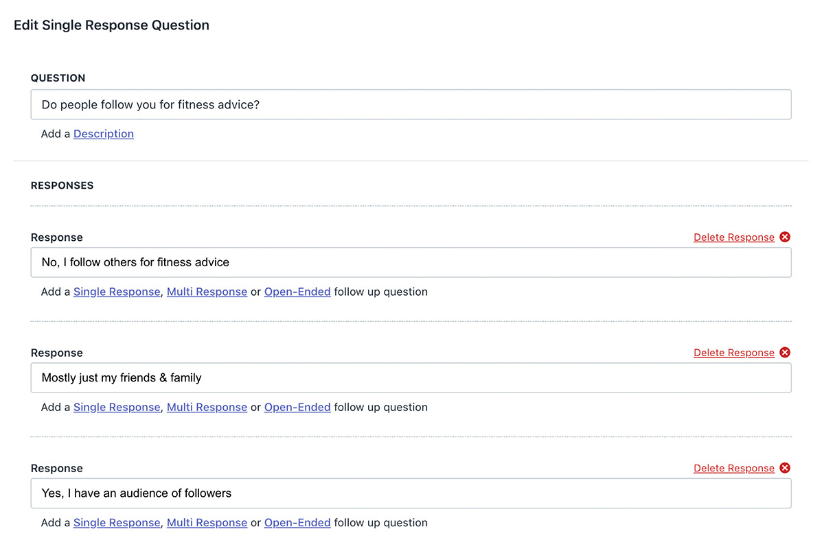 Beyond just plugging your vertical into this question (we’ll use fitness in the example here), there’s a bit of an art to the messaging. For instance, asking the question in this yes/no fashion makes it easy to answer while still getting to the point. It’s also a good idea to consider what kind of influencers you want to learn about here, as a fitness brand will likely gather different responses depending on whether they ask about “fitness advice” vs “health advice”.