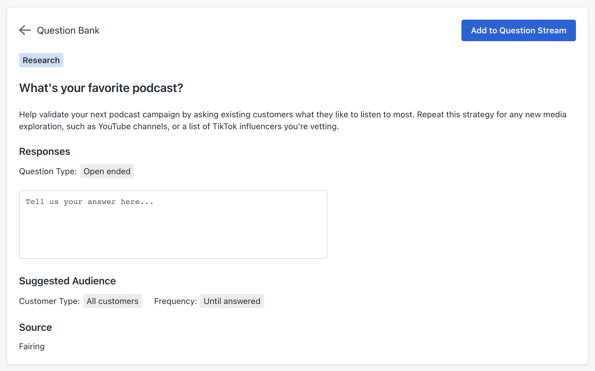In our Question Bank, you’ll notice the templated language is, “What’s your favorite podcast?” This is based on the popularity of trending questions in DTC, but depending on your media mix, you may be more interested in asking “What’s your favorite YouTube channel?”, and so forth.