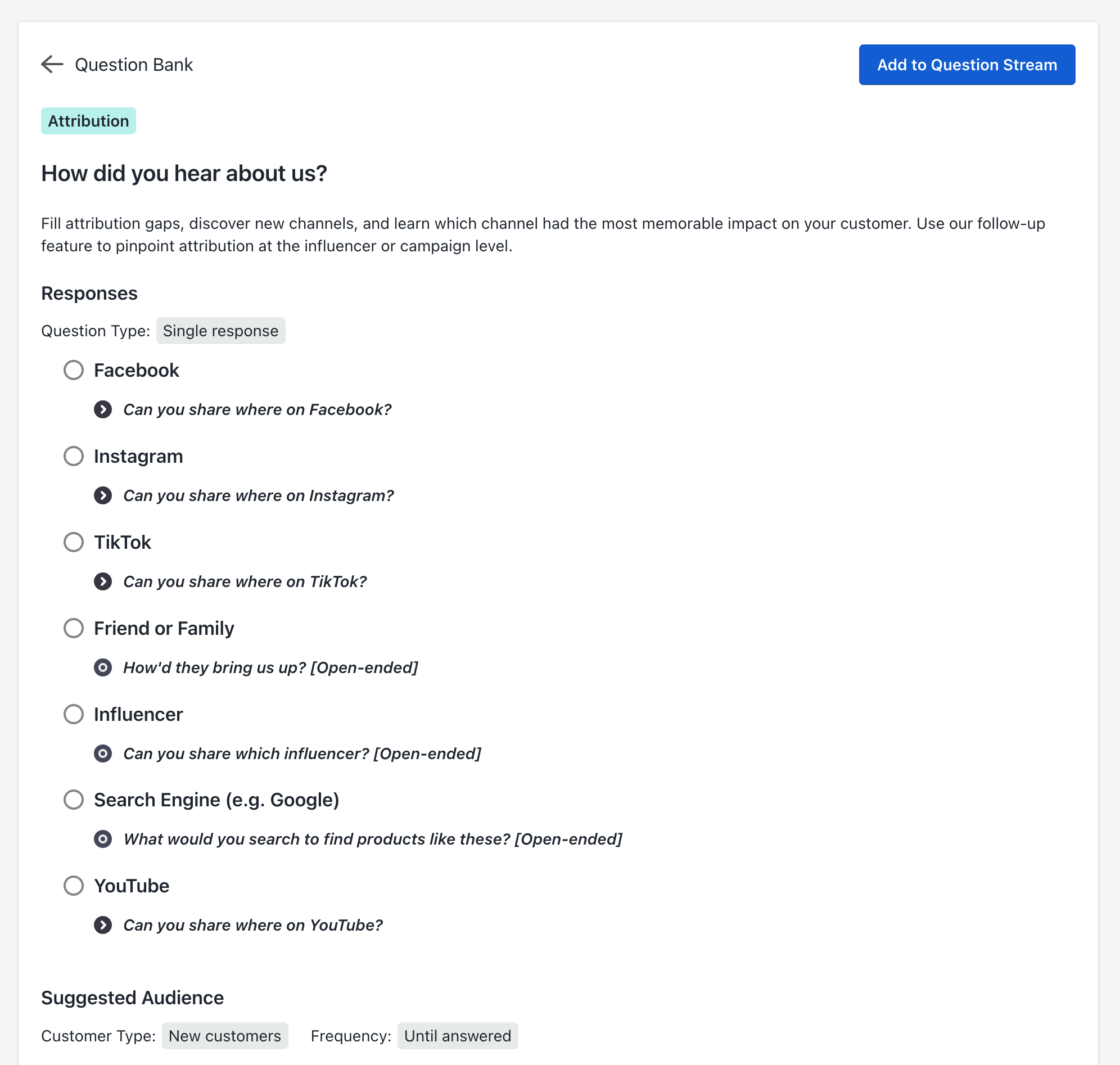 Categorized by our core use cases (Attribution, Personalization, CRO, Research), each card packs a best practice question into a format that plugs into your Question Stream with a single click. If you’ve only been using Fairing to ask “How did you hear about us?”, a brief browse through these cards will reveal just how much more you could be capturing along your customer’s journey — even if you start by simply asking a follow-up question, or adding another attribution question to focus on ToFu or last-touch insights.