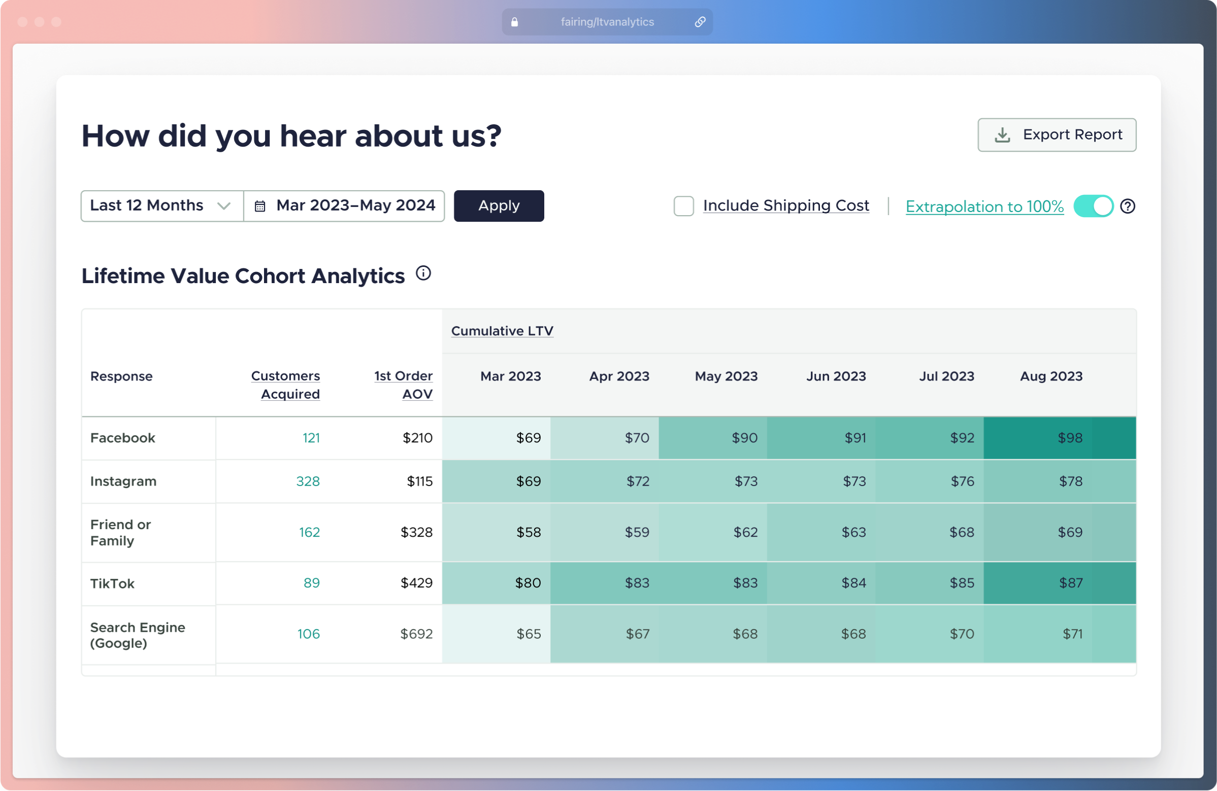 Paired with Question Stream™, Fairing’s LTV Analytics is the only product that takes into account HDYHAU data, giving you a more accurate view on LTV per channel.